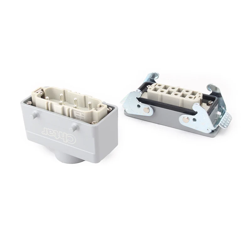Đầu nối hạng nặng chèn 35A 6 chân được làm bằng nhôm H16B Vỏ của đầu nối hạng nặng. Nó được làm bằng vật liệu PC bền và đồng thau mạ bạc. Chân đồng thau CHTAR được mạ bạc có chất lượng tốt và độ dẫn điện tốt hơn. Nó chứa cao su bịt kín để làm cho nó có tính năng chống thấm nước tốt.