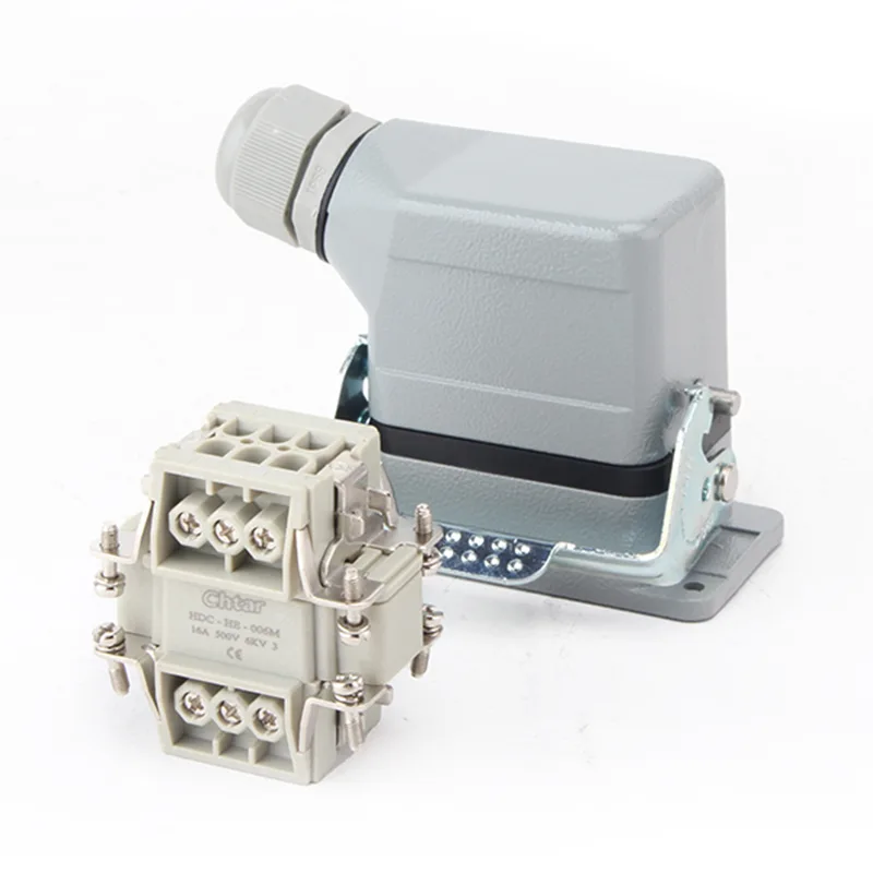Đầu nối hạng nặng CHTAR 6 Pin AG này được sử dụng rộng rãi với HE HD HEE, HDD. Nó là phần đế và phần vỏ phụ của các đầu nối hạng nặng. Nó được làm bằng nhôm và được thiết kế dưới dạng khóa đơn. Loại khối thiết bị đầu cuối hạng nặng thân thiện với người dùng.