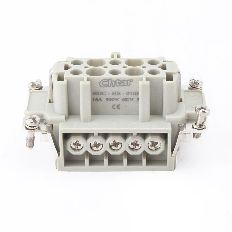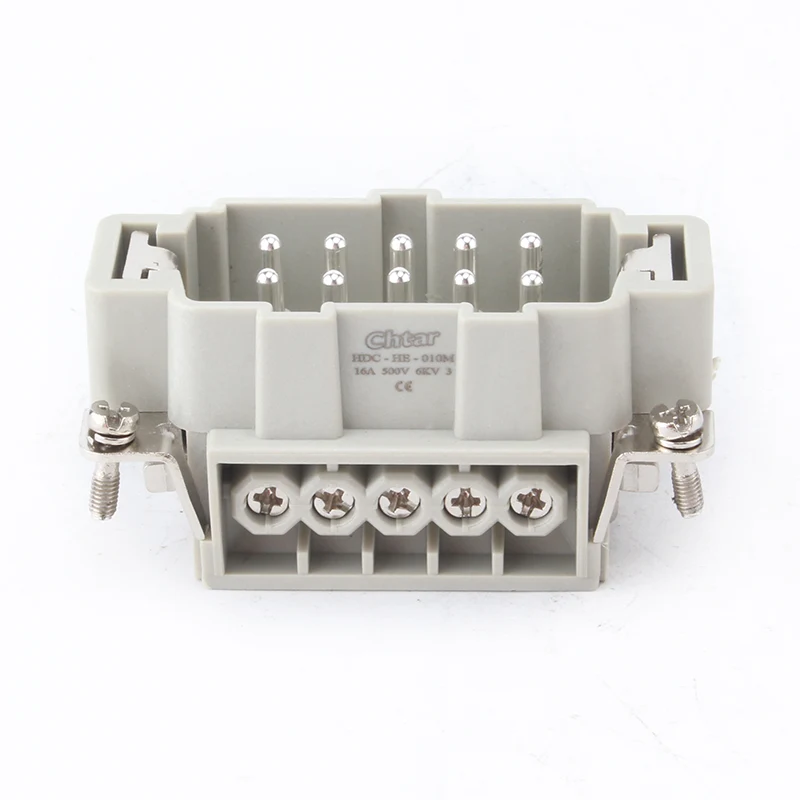 Đầu nối hạng nặng chèn M/F 10 chân bền bỉ của CHTAR được sử dụng cùng với vỏ H10B của đầu nối hạng nặng. Nó có 10 chân và được kết nối bằng 10 dây. Chúng được làm bằng PC có độ bền cao và có các chân cắm bằng đồng mạ bạc bên trong. Chúng tôi mong muốn trở thành đối tác lâu dài đáng tin cậy của bạn tại Trung Quốc.
